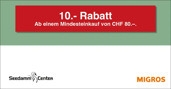 10.– Rabatt ab einem Mindesteinkauf von CHF 80.–. Auf das gesamte Migros-Supermarkt-Sortiment. Einlösbar im Migros-Supermarkt Seedamm-Center. Ausgenommen sind Gebührensäcke und -marken, Vignetten, Depots, Serviceleistungen, E-Loading, iTunes-/App-Karten, SIM-Karten, Gutscheine, Geschenkkarten und Smartboxen.