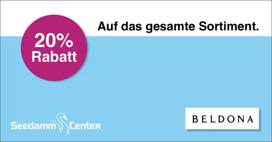 Der Gutschein ist nur einlösbar bei Beldona im Seedamm-Center Pfäffikon SZ. Ausgenommen Giftcards. Nicht kumulierbar mit anderen Rabatten und Vergünstigungen. Pro Einkauf kann nur ein Gutschein eingelöst werden. Barauszahlung nicht möglich.