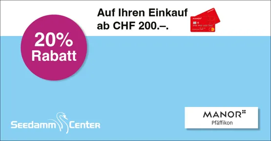 Einlösbar nur bei Manor Pfäffikon. Der Bon ist nur gültig für einen einmaligen Einkauf. Bitte diesen Manor-Bon vor dem Tippen an der Kasse abgeben. Keine Barauszahlung, keine Kontogutschrift. Nur gültig mit Manor World Mastercard® und Manor Treuekarte. Der Bon ist mit anderen Rabatten, Promotionen und Aktionen nicht kumulierbar. Kein Ersatz bei Verlust oder Diebstahl. Nicht gültig für den Online-Shop.
