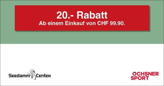 Nur einlösbar in deinem OCHSNER SPORT Store Seedamm-Center Pfäffikon. Nicht kumulierbar mit anderen Aktionen. Nicht gültig für Mietware, Serviceleistungen, Geschenkkarten und Direktbestellungen.