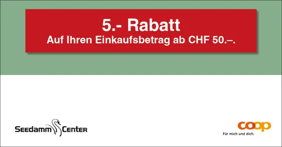 CHF 5.– Rabatt auf Ihren Einkaufsbetrag ab CHF 50.–. Einlösbar in Ihrem Coop Supermarkt Pfäffikon SZ Seedamm. Bon an der Kasse abgeben. Bon nur einmal einlösbar. Nicht kumulierbar mit anderen Bons.